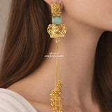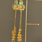Featuring a gold-tone base, a green glass stone centerpiece, and elegant ghungroo drop chains, the earring creates a dramatic yet graceful silhouette. Its elongated design makes it a standout accessory, perfect for elevating both bridal and festive looks.