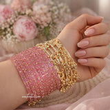 Designed for brides who love timeless elegance, this set blends the charm of Kashmiri bangles with the festive beauty of Indian glass bridal churiya. The soft pink tones paired with gold embellishments create a graceful, feminine look perfect for weddings and celebrations.