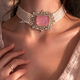 This stunning statement choker features a large rose pink doublet centerpiece, beautifully framed with intricate gold detailing and sparkling polki-style CZ stones. The structured multi-layer pearl strands add richness and dimension, giving the necklace a regal bridal finish.